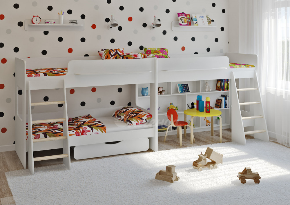 Две удобные белые полки Л-01 над каждой кроватью обеспечат Вашим детям удобное хранение мелочей.